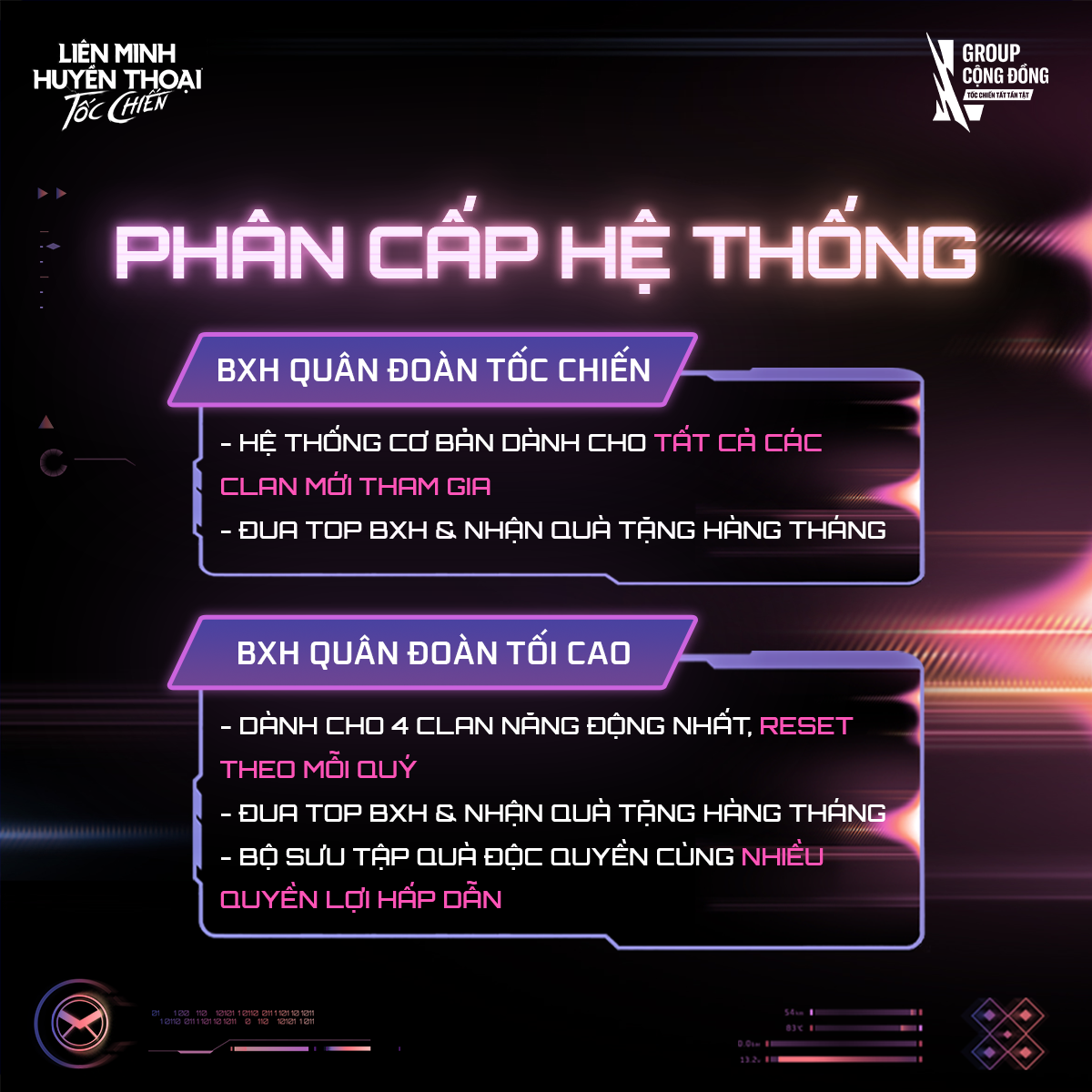 - Bảng xếp hạng Quân Đoàn Tốc Chiến: Sân chơi dành cho các Clan mới gia nhập hệ thống.