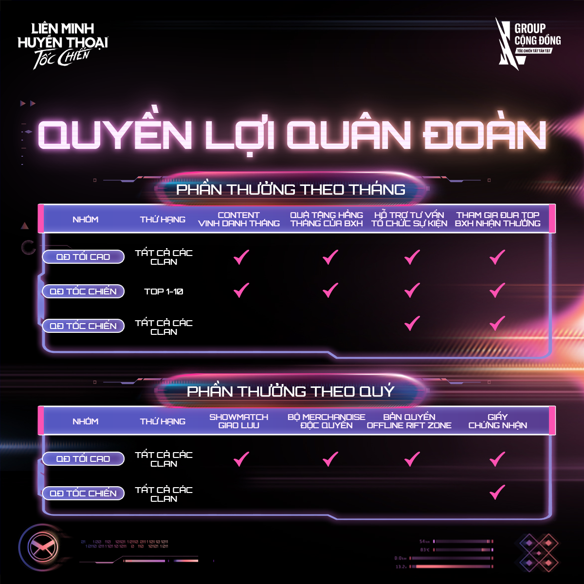 - Áp dụng cơ chế VIP: 02 Quân Đoàn dẫn đầu Bảng xếp hạng Tốc Chiến mỗi quý sẽ được thăng hạng trực tiếp lên nhóm Premium.