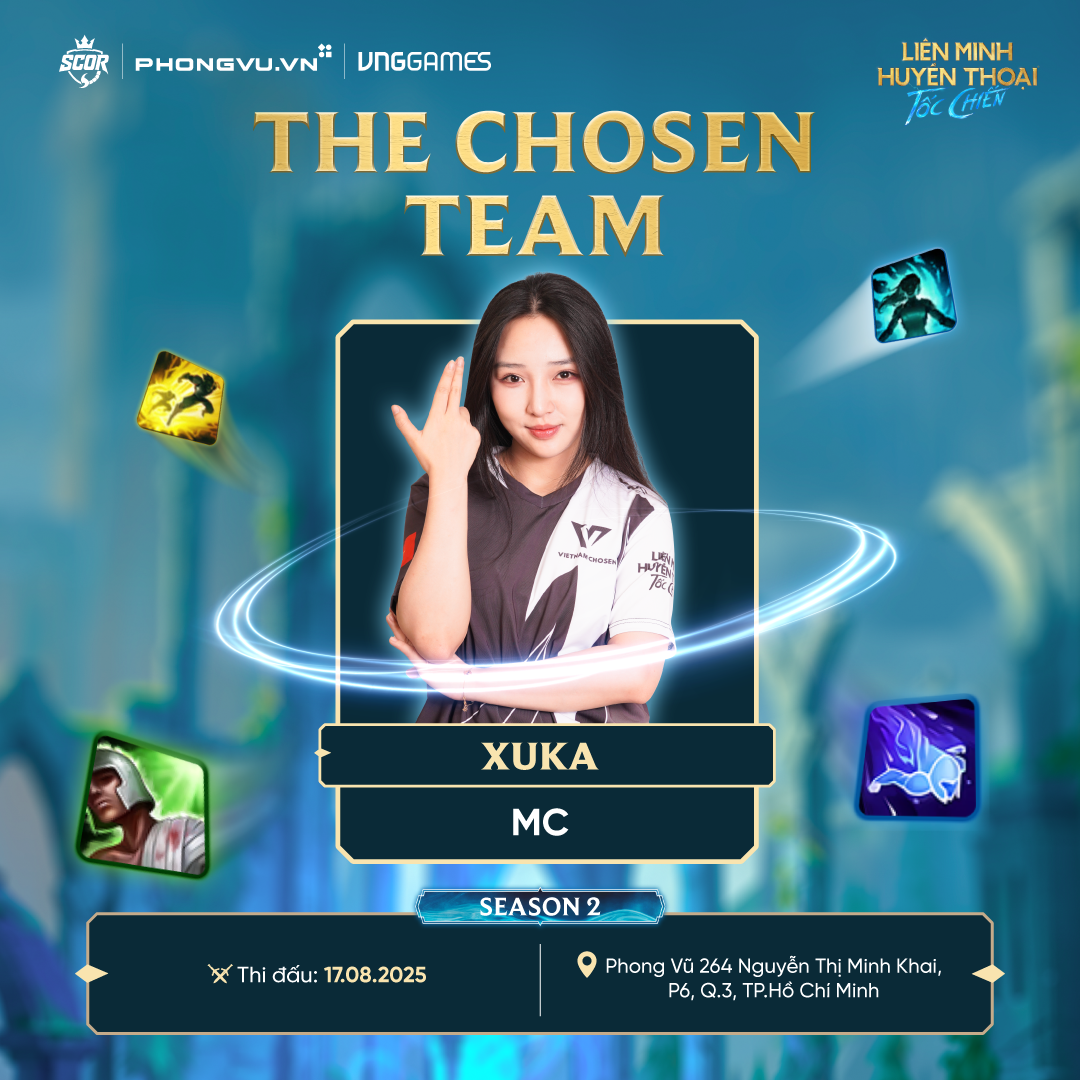 Xuka – MC chính thức của The Chosen Team Mùa 2, TikToker đình đám trong cộng đồng game thủ Việt, mang đến bầu không khí sôi động và lối dẫn dắt cuốn hút.