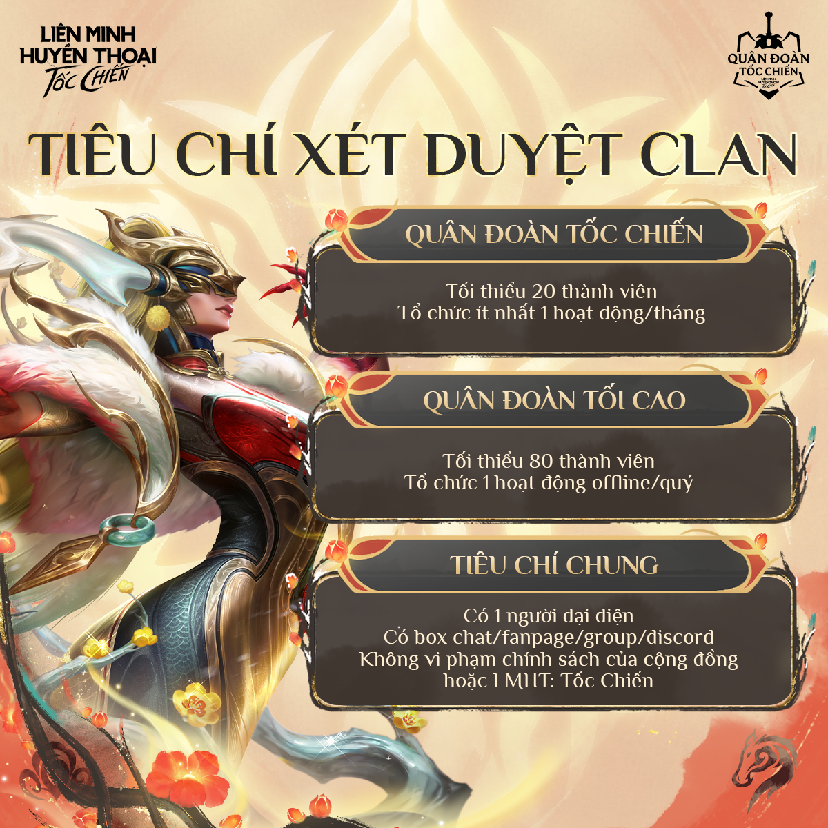 Nhằm đảm bảo chất lượng vận hành và tính đồng bộ của hệ thống, Ban Điều Hành sẽ tiến hành xét duyệt các Clan đăng ký tham gia dựa trên những tiêu chí sau: