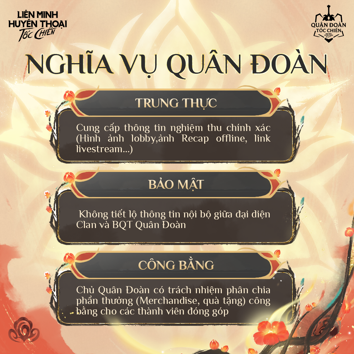 - Chủ Quân Đoàn có nghĩa vụ phân phối minh bạch các phần thưởng, đảm bảo quyền lợi cho những thành viên đóng góp tích cực.
